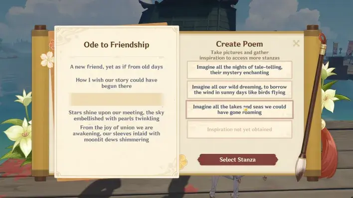 카메라 가젯이 아닌 Paimon 메뉴의 "사진 찍기" 기능을 사용하여 이러한 전문 분야를 찾아 최소 4개의 이미지를 스캔하고 캡처해야 합니다. 사진을 찍고 나면 Lenne과 Ootomo로 돌아가서 새 구절을 쓰고 시를 완성하는 데 사용할 것입니다.