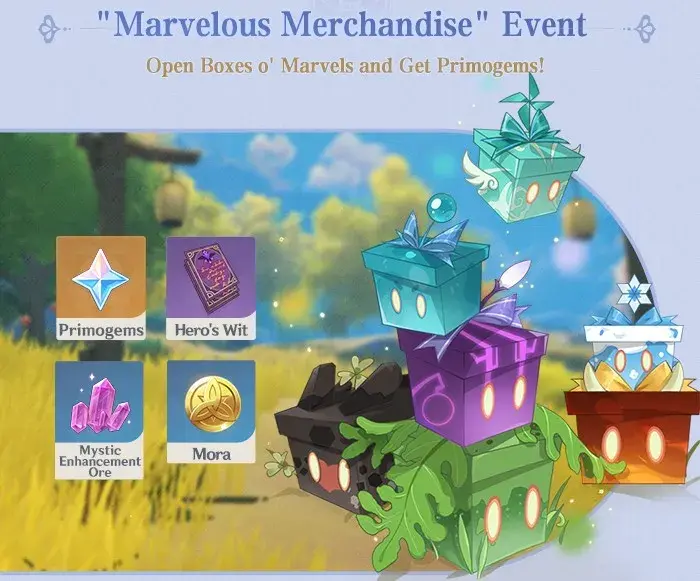 이벤트 기간 동안 Mondstadt의 상인 Liben에게 가서 Primogem 및 기타 보상이 포함된 Boxes o' Marvels를 여는 데 필요한 재료를 건네줄 수 있습니다.