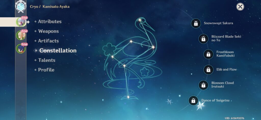 - 그녀의 별자리인 Grus Nivis는 라틴어로 "눈학"을 의미합니다. 이것은 실제 별자리 "두루미"(학)에 대한 언급일 수 있으며, "왜가리"라고도 하며, 이는 Kamisato Ayaka의 배너 제목 "Frostflake Heron" 도 그녀의 별자리에 대한 실행 가능한 번역이 될 수 있음을 의미합니다.