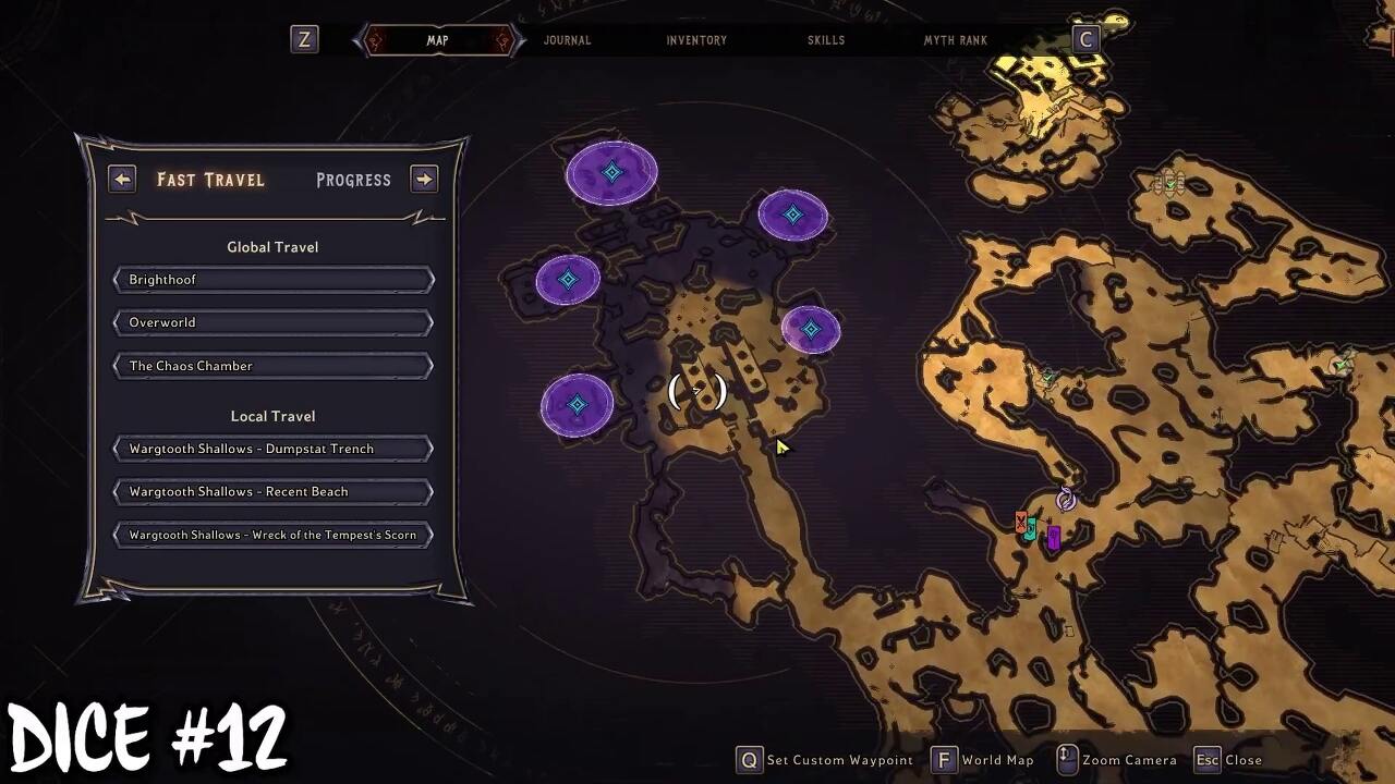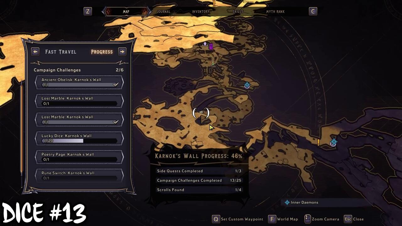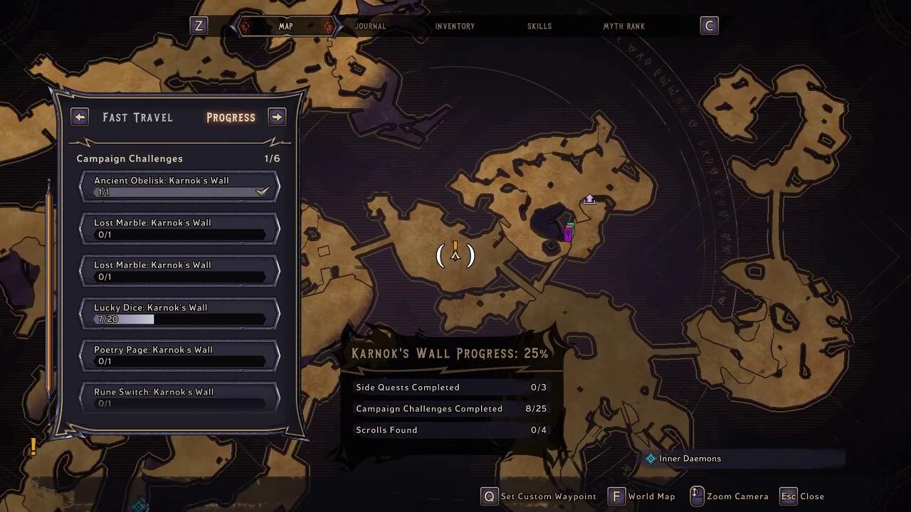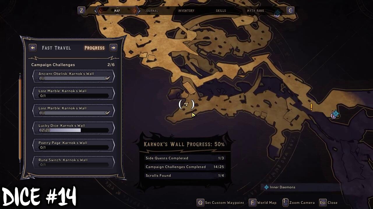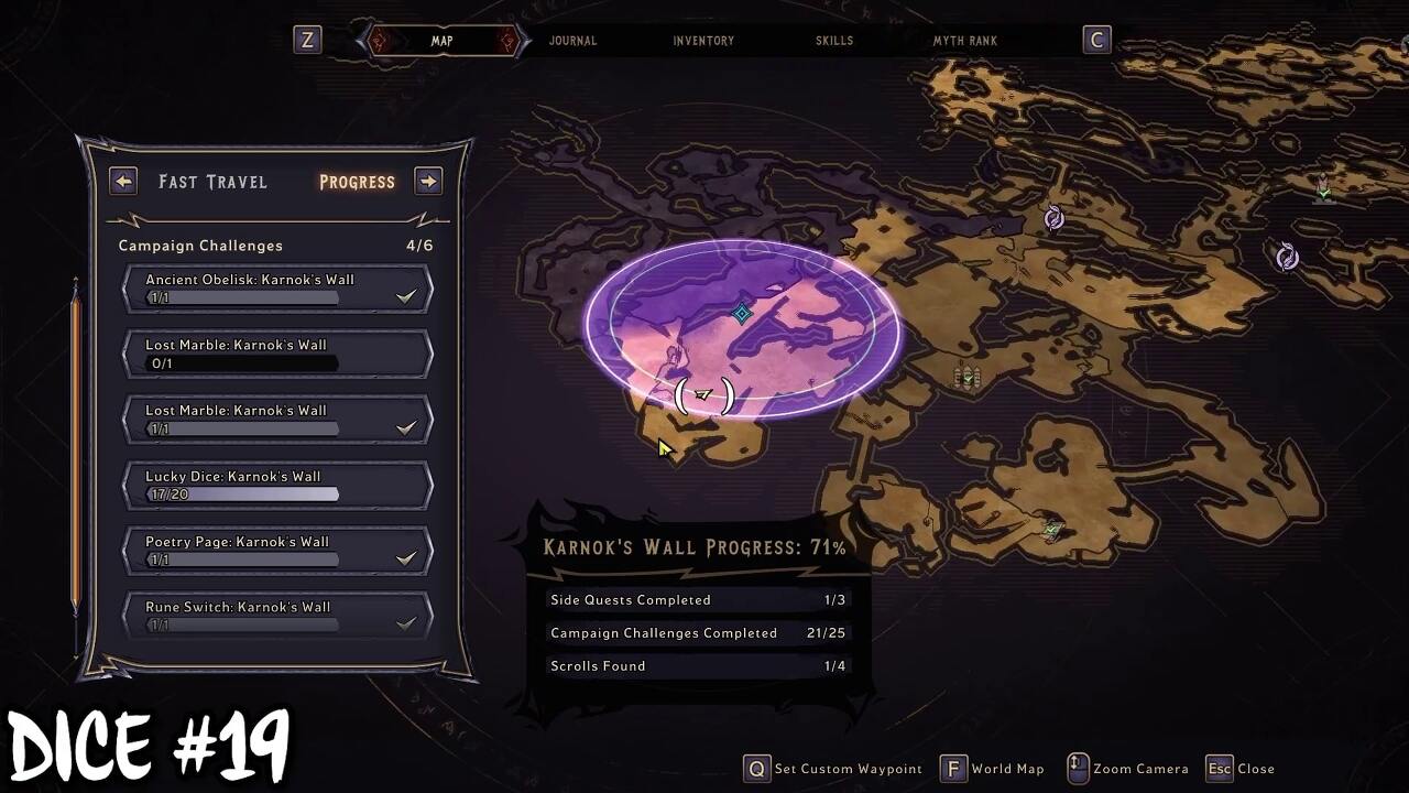 Karnok's Wall을 완료하면 마법의 보라색 게이트를 잠금 해제할 수 있습니다. 지도 위치로 이동하여 마법의 문을 엽니다. 행운의 주사위는 절벽 가장자리 근처의 게이트 너머에 있습니다.