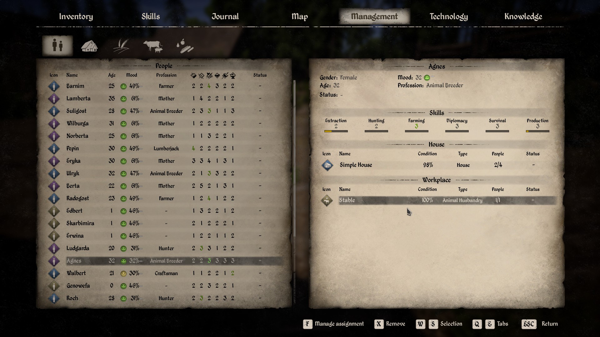 또한 직장이 있는 만큼의 주민만 모집하는 것이 좋습니다. 각 작업자 건물에는 거주자에게 할당할 수 있는 제한된 수의 선별된 직업 유형이 있습니다. 다시 한 번, 생산성을 극대화하기 위해 작업을 할당할 때 각 주민의 기술을 고려하십시오. 인스펙터 모드에서 볼 수 있는 모집 가능한 주민; 그들의 기술 특성은 HUD로 표시됩니다.
