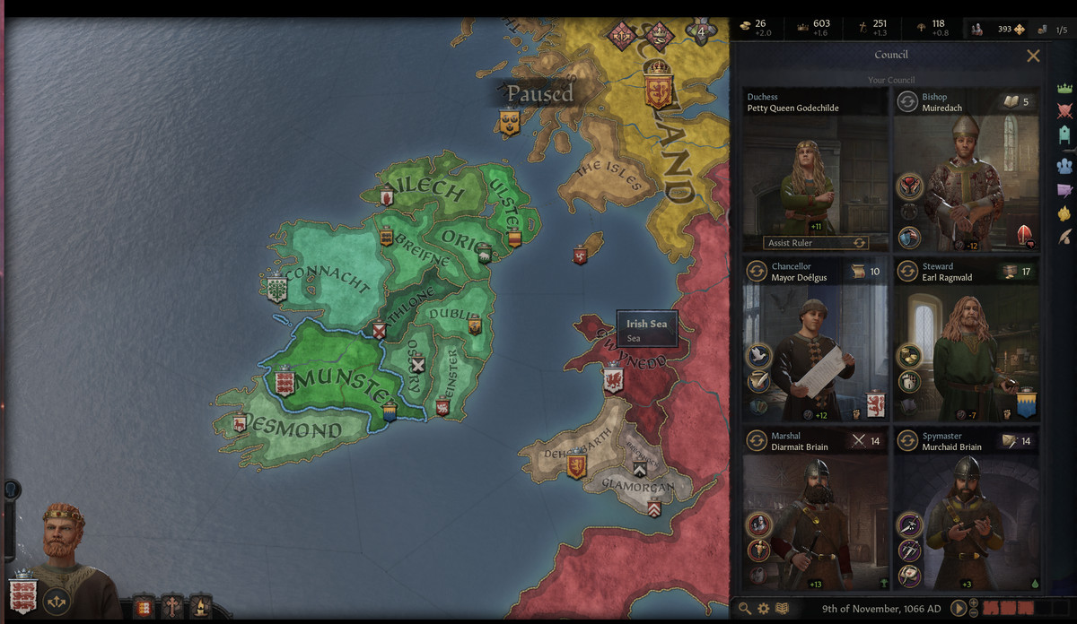 왕국에서 대부분의 주요 결정을 내리지만, 혼자서는 왕국을 통치하지 않을 것입니다. 도메인 운영의 여러 측면에서 도움을 주기 위해 6명의 평의회 구성원이 영역의 다른 영역에 집중하게 됩니다.