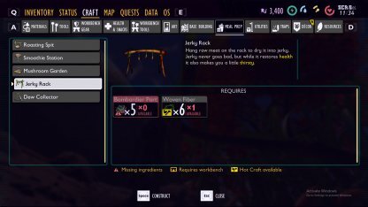 먼저 Roasting Spit으로 해결할 수 있지만 가능한 한 빨리 Jerky Rack 을 구입하는 것이 좋습니다 ! 필요한 부품 은 다소 위험한 폭격수 딱정벌레 에서 가져오므로 더 나은 무기 를 얻을 때까지 이 작업을 시도하지 않는 것이 좋습니다 ! 육포 선반을 사용하면 음식이 상할 염려 없이 더 많은 음식을 저장할 수 있으므로 매우 유용합니다!