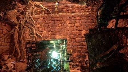 풀캐스터를 사용하여 근처의 상자를 당신 쪽으로 당기고, 그것을 사용하여 위층으로 올라갈 수 있습니다. 왼쪽으로 향하여 바깥쪽 통로로 이동한 후 틈을 건너 반대편으로 이동합니다.