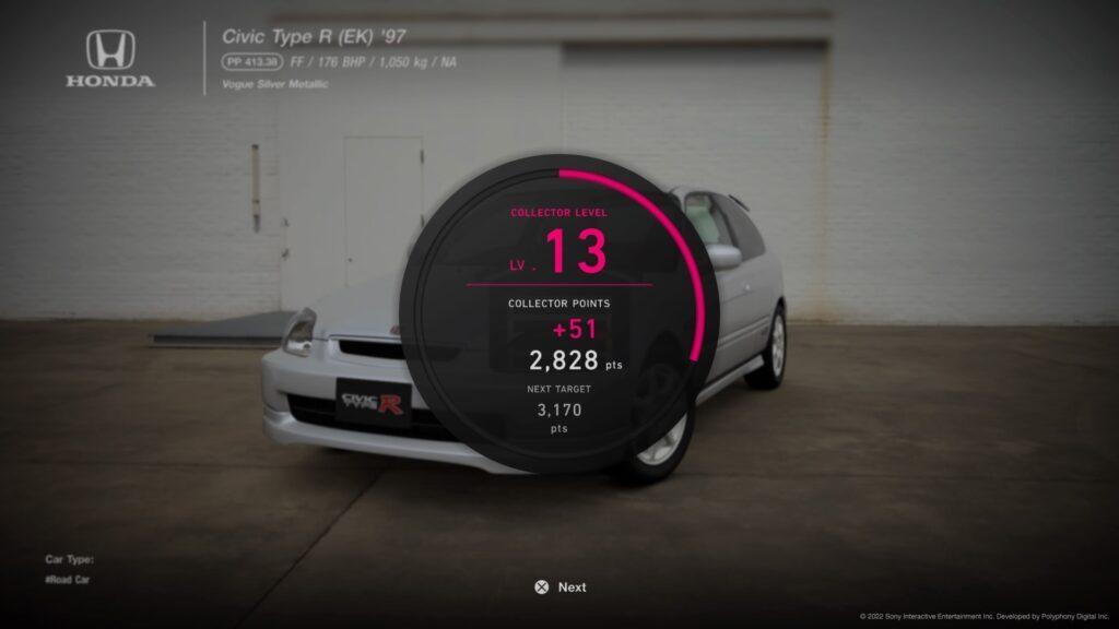 획득한 각 자동차는 수집가 포인트 형태로 XP를 얻습니다. 그란 투리스모 7의 메인 'XP 레벨'로, 모든 차를 모으는 것이 궁극적인 목표입니다.