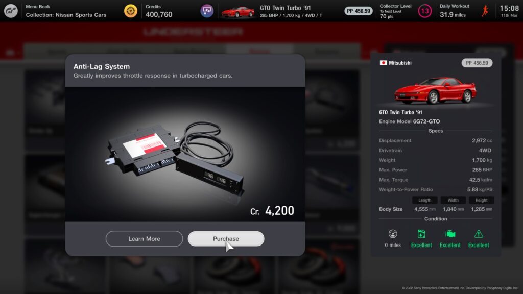 Toyota Supras, Subaru Imprezas 및 Nissan GT-Rs와 같은 Gran Turismo 7 내 특정 차량에 추가할 수 있습니다 . Tuning Shop 내에서 부품으로 사용할 수 있으며 기본적으로 활성화되어 있지 않습니다.