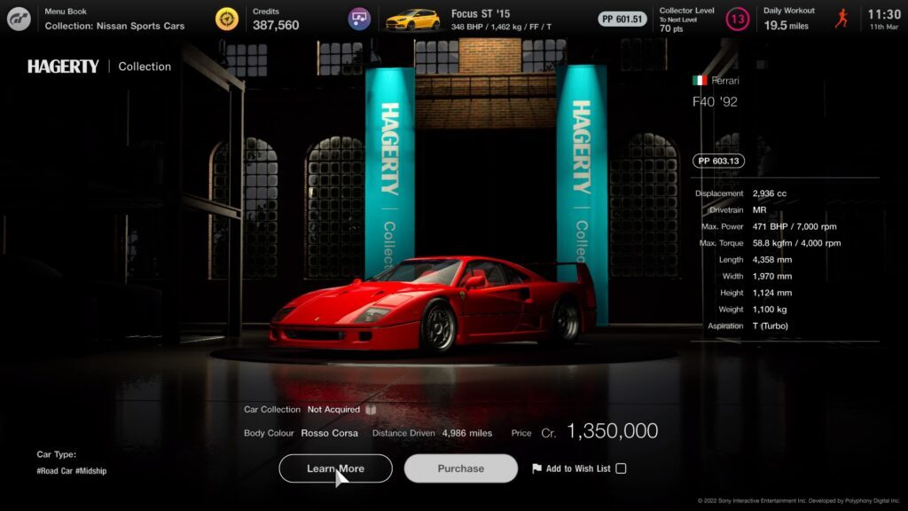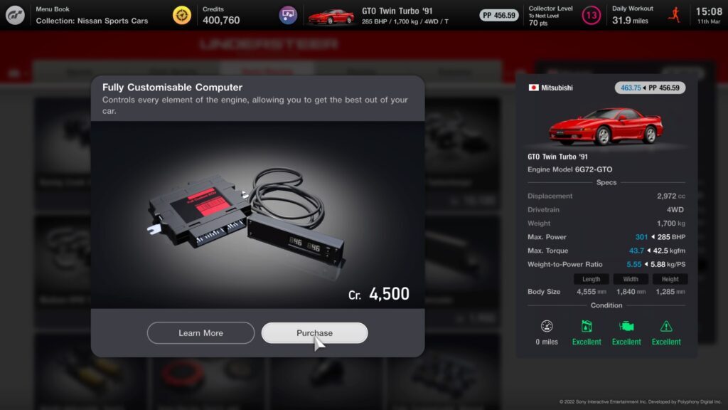엔진 출력, 타이어 선택, 기어비 및 다운포스 수준과 같은 매개변수가 모두 이 수치에 반영되므로 튜닝 샵을 방문하여 차량의 수치를 높이거나 자동차 설정 화면을 방문하여 설정을 조정하고 감소시켜야 합니다. PP 수준 – 이벤트 요구 사항에 따라 다름.