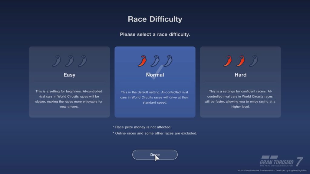 아하, 메뉴에 숨겨져 있습니다. 레이스가 아닐 때 언제든지 게임 왼쪽 상단의 GT 메뉴를 선택한 다음 옵션과 레이스 난이도를 차례로 선택하십시오. 세 가지 '고추' 레벨 중에서 선택할 수 있습니다.