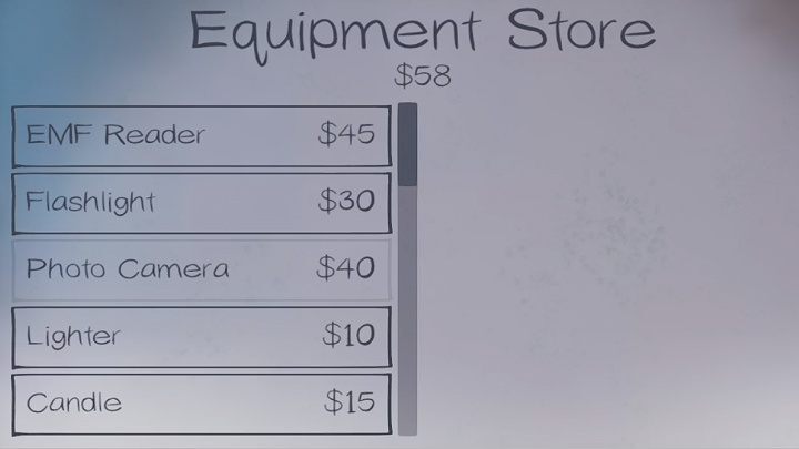 손전등, 카메라, 양초, 자외선 등 필요한 모든 항목은 유령 사냥꾼의 메인 룸에서 구입하여 임무에 가지고 갈 수 있습니다. 더 높은 난이도에서는 임무를 무사히 마치고 돌아온 경우에만 구매한 아이템을 보관할 수 있습니다.