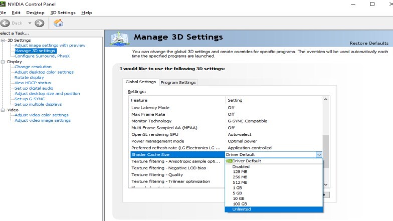 Nvidia의 셰이더 캐시를 무제한으로 설정하면 특히 게임을 꽤 오랫동안 플레이한 경우 끊김 현상이 방지됩니다.