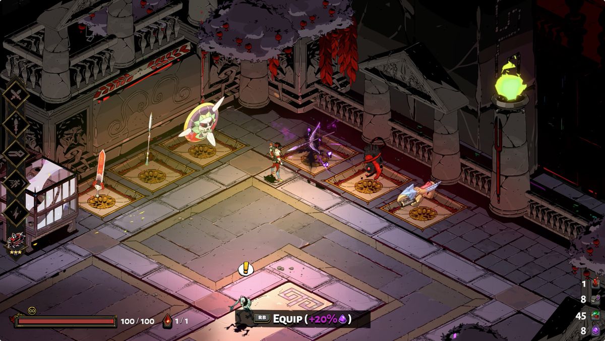 Hades 가 실행될 때마다 무기고에 있는 무기 중 하나가 주변에 보라색 색조를 띠게 됩니다. 이것은 당신이 이번 실행에 그것을 사용하면 당신이 보너스 어둠을 얻게 된다는 것을 의미합니다. (Skelly는 어느 시점에서 이것을 설명하지만 놓치기 쉽습니다.)