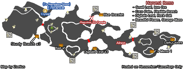 지금은 붉은 고기 x3 가 들어 있는 "드리프트"를 찾을 수 있는 작은 해변으로 이어지는 왼쪽 길을 가십시오 . 드리프트는 때때로 해안에서 무작위로 생성되고 다른 항목을 포함하며 지도 완성에 영향을 미치지 않는다는 점을 제외하면 보물 상자와 매우 유사합니다. 그들을 조심하십시오.