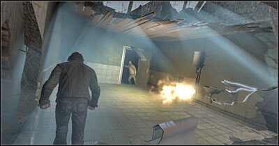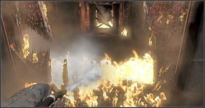 소화기 쪽으로 가서 주우세요. 이 작업이 완료되면 화염에 더 가까이 다가가 소화기를 사용하여 불을 끄기 시작합니다. 분명히 이 개체를 사용하려면 FPP 보기로 전환해야 합니다. 해당 지역이 정리되면 소화기를 치우고 위층(스크린)으로 올라갑니다. 왼쪽으로 진행하여 건물을 나옵니다.