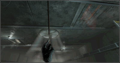 밧줄을 잡을 가능성에 대한 정보는 무시하십시오. 처음에는 몇 가지 준비를 해야 하기 때문입니다. 낮은 층으로 내려가 새로운 소화기를 찾으십시오. 이 물체를 집어 작은 플랫폼(화면)에 놓습니다. 돌아서서 두 번 올라가서 위층으로 돌아갑니다.