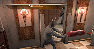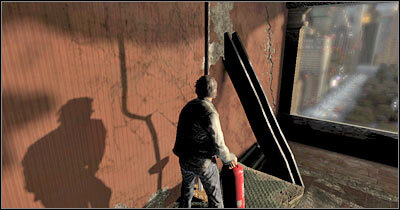 여기에서 귀하의 목표는 가능한 한 빨리 새 발코니(스크린)에 도달하는 것입니다. 난간을 놓고 빠르게 왼쪽으로 이동합니다. 벽의 많은 부분이 구멍을 남길 때까지 기다리십시오. 건물 안으로 들어갈 수 있습니다. 이 작업이 완료되면 카메라가 해당 영역을 스윕할 때까지 기다립니다.