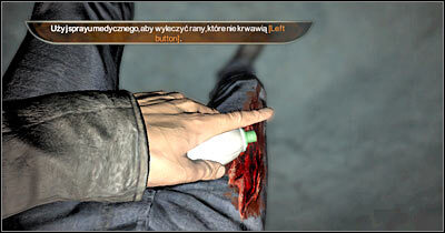 가장 가까운 방으로 가서 새로운 힌트를 읽으십시오. 상처를 치유하는 방법을 배우게 됩니다. 이제 주변을 탐색하는 데 집중해야 합니다. 액션 키를 눌러 대부분의 찬장과 사물함을 열 수 있음을 기억하십시오. 몇 개의 배터리, 의료 스프레이 및 덕트 테이프를 소지해야 합니다. H 키를 누르면 치료해야 할 신체 부위가 표시됩니다(화면). 스프레이를 사용하여 상처를 치료하십시오. 완전한 건강 상태로 돌아오면 이 창을 닫으십시오.