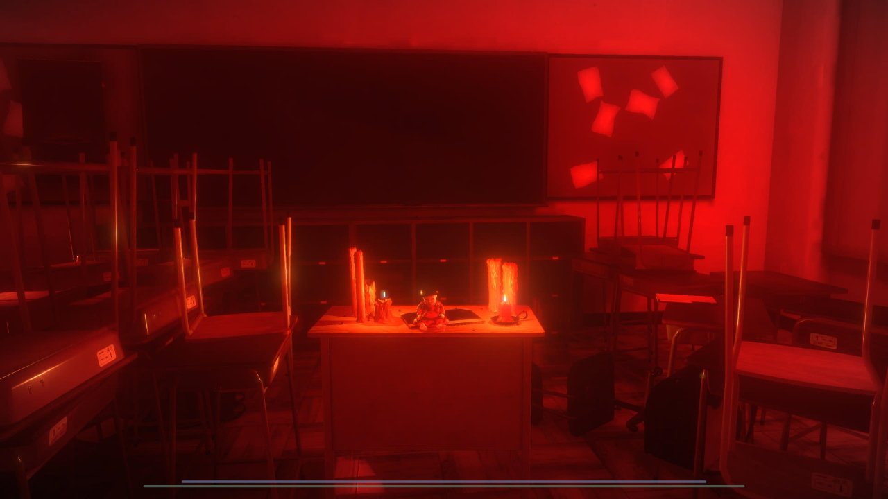 복도 끝에서 문으로 들어가면 세 명의 리스너가 있는 교실이 나옵니다. 숨을 참으며 방의 왼쪽을 돌아 다니며 뒷 구석에있는 책상에서 학교 열쇠를 찾으십시오. 오른쪽 문으로 나가세요. 복도에서 또 다른 플래시백을 얻을 수 있습니다. 옆집을 열어 인형을 찾으세요.