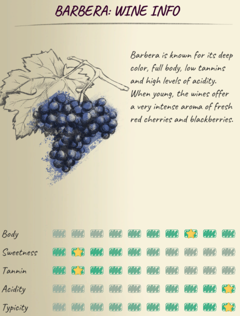 Barbera "barb"는 모든 게임을 시작할 때 놀랍도록 훌륭하고 수익성이 좋은 포도 품종입니다. 일반적으로 가장 작은 지역인 Bricco 지역에서 잘 자랄 수 있지만 미늘의 상대적으로 높은 가격은 최종 게임까지 계속 미늘을 병에 담을 가능성이 높다는 것을 의미합니다.