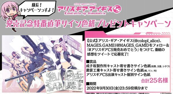 【공식】앨리스 기어 아이기스 ( @colopl_alice ), MAGES.GAME ( @MAGES_GAME ) 양쪽의 계정을 팔로우하고, 「#앨리스 기어 CS 발매 축하합니다」를 붙여, 2022년 9월 10일의 방송 프로그램의 감상을 중얼거린 사람 중에서 추첨으로 총 25명에게 '앨리스 기어 아이기스 CS' 출연 성우의 사인 색지를 선물.