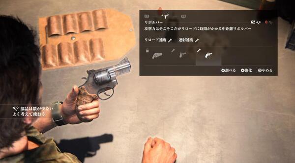 본작에 있어서의 강력한 무기는 「총」이지만, 탄환에 한계가 있기 때문에 사용하기 어렵다. 게다가 근접무기는 내구도가 있어, 몇번인가 사용하면 망가져 버리는 것이다. 본작을 처음 플레이하는 사람은, 물자를 확보·절약하는 것의 소중함을 배우게 될 것이다.