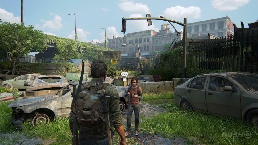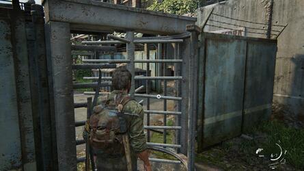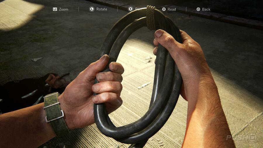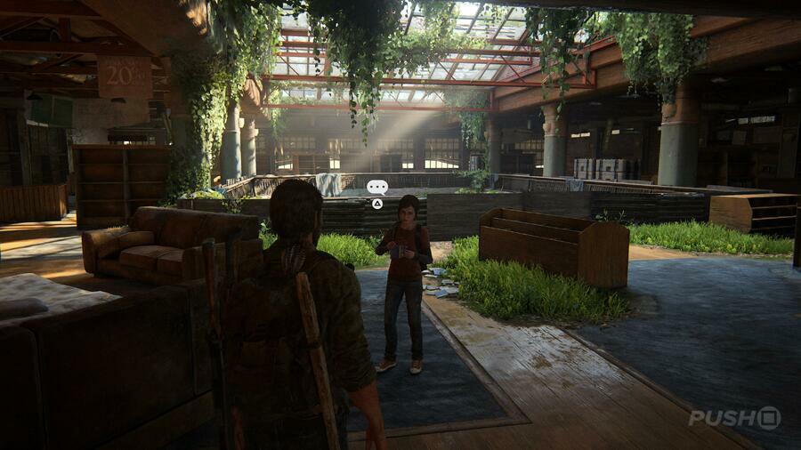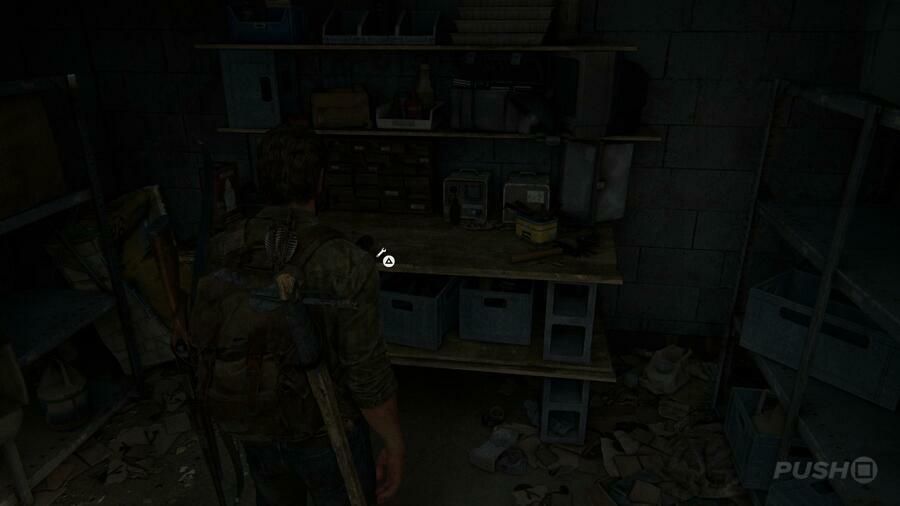 차고 문 앞에 서 있는 길 건너 Ellie를 따라잡기 전에 모든 건물을 약탈하십시오. 삼각형 버튼을 눌러 들어올립니다. Ellie가 지적한 것처럼 "여기에는 꽤 지저분한 것들이 있습니다."