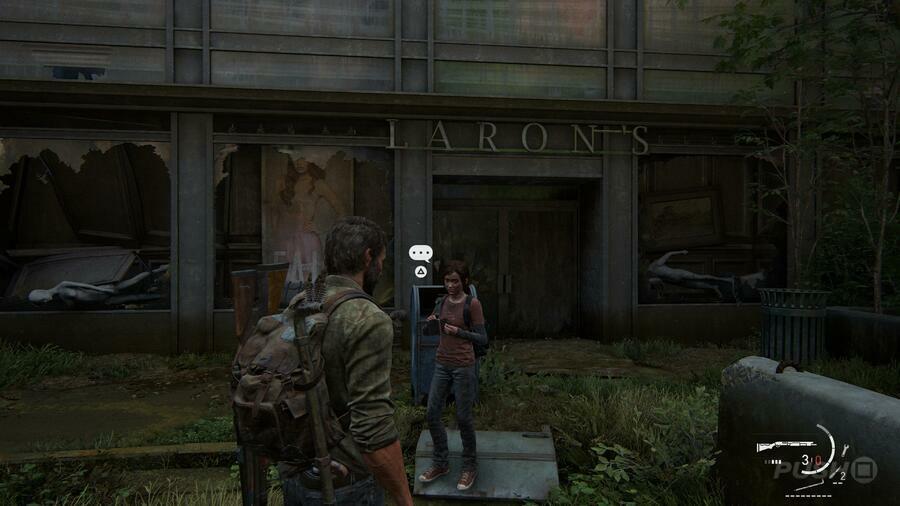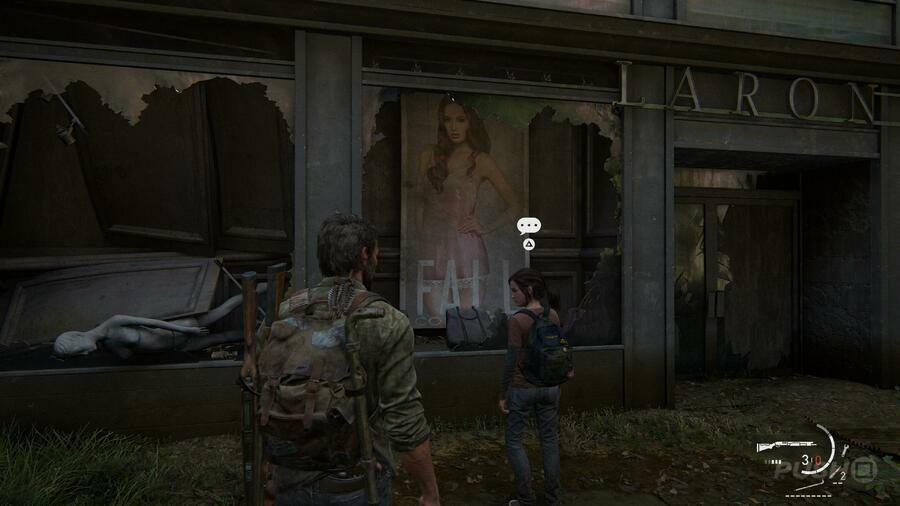 산적들이 사라진 후 돌아서서 Larson's라는 가게로 가십시오. Ellie와의 선택적 대화 를 유발하는 모델의 창에 포스터가 있습니다 .