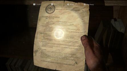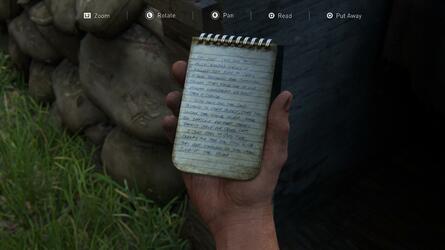 이전 선택적 대화 에서 배급에 대해 토론한 후 검문소 사무실에서 Lost Hill Note 라는 유물 을 찾을 수 있습니다. 그것을 얻기 위해 모래 주머니를 뛰어 넘습니다. 뒤에 있는 탁자 에도 무기 파츠 가 있습니다.