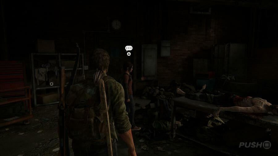 High School Escape 이후의 긴 컷신이 끝나면 즉시 일부 도적을 처리해야 합니다. 네모난 버튼을 눌러 목을 베겠다고 위협하는 사람에게서 벗어나고 Ellie가 방을 가로질러 나갈 수 있도록 도와주세요.