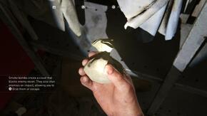 유일한 문을 통해 이 방을 나가기 전에 문 왼쪽에 있는 선반 캐비닛에서 연막탄 을 꼭 잡아야 합니다.