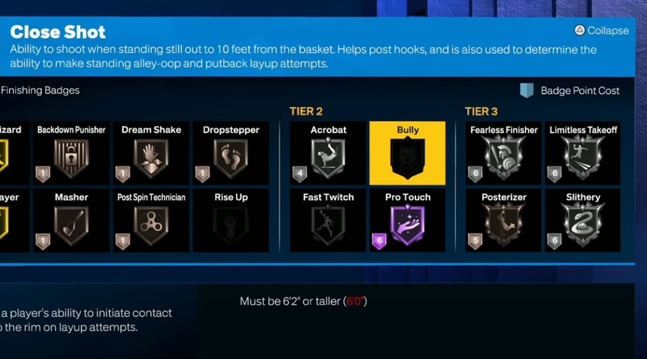 Close Shot : 바스켓에서 10피트 떨어진 상태에서 슛을 할 수 있는 능력. 포스트 후크를 돕고, 스탠딩 앨리웁 및 풋백 레이업 시도를 할 수 있는 능력을 결정하는 데도 사용됩니다.