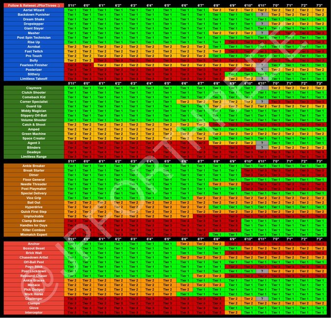 | 무한 이륙 | 바스켓을 공격할 때 이 배지를 가진 플레이어는 다른 플레이어보다 아버지로부터 덩크 시도를 시작합니다. |