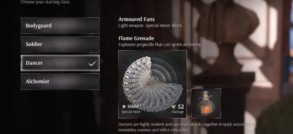 댄서 클래스 의 스타터 무기 는 아머드 팬이라고 하며, 너무 무겁지도 가볍지도 않은 무기로 알려져 있다. 그들은 치명적일 수 있는 적에게 근거리 피해를 입히고 쓸모없게 만들 수 있습니다.