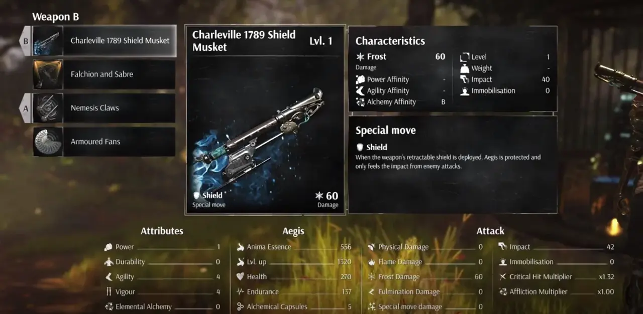Charleville 1789 Shield Musket은 냉기 피해를 주는 원거리 무기입니다. 충분한 횟수의 피해를 입고 프로스트 미터가 채워지면 적을 얼리는 능력이 있습니다. 머스킷은 일반 적과 보스에게 동일하게 작동합니다.