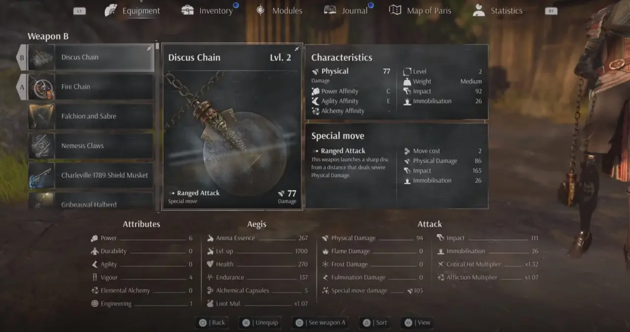 이 Steelrising 무기는 상당한 피해량과 놀라운 범위를 가지고 있으며 이 모든 것이 무기의 전반적인 위대함에 기여합니다. 일부 공격 중에는 도달 범위를 더 멀리 확장할 수도 있습니다. 또한 사용자의 위력, 민첩성, 연금술에 비례하여 효과가 증가합니다.