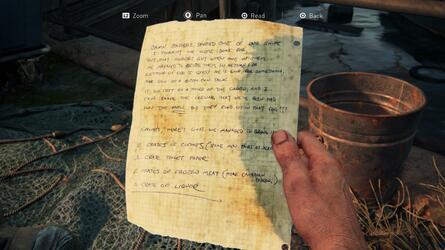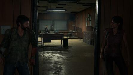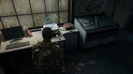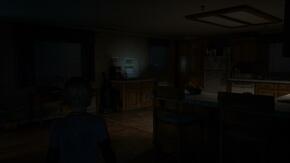 부엌에서 휴대폰이 울리기 시작합니다. 그것을 집어 들면 Joel의 형제 Tommy가 그에게 전화를 걸고 있음을 알 수 있습니다. 오른쪽 냉장고에는 읽을 수 있는 메모가 있습니다. 한편, 왼쪽에는 유리문이 열려 있는 사무실이 있습니다. 안으로 들어가면 조엘을 다시 알게 되며 결국 Tommy의 차로 서둘러 타게 될 것입니다.
