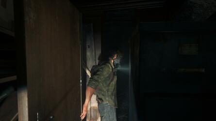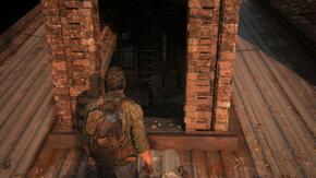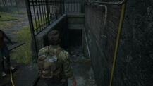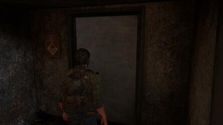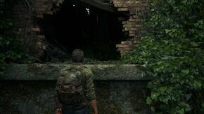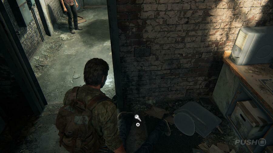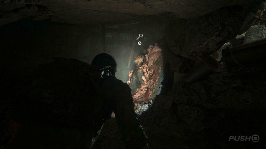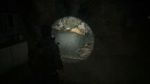 Tess를 따라 계단을 내려가면 결국 그녀는 다음 방에 있는 몇 개의 포자를 지적할 것입니다. Joel이 방독면을 쓸 때까지 기다렸다가 오른쪽 벽에 있는 구멍에 주의하세요.