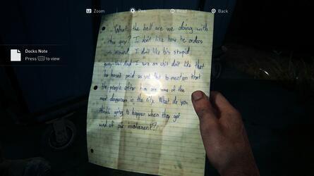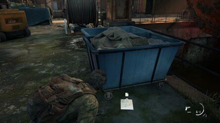이전 위치에서 오른쪽 진입점을 통해 건물 내부로 이동합니다. 오른쪽에 천과 재료가 들어 있는 두 개의 파란색 쓰레기 수거통이 보일 것입니다. Dock Notes 라는 이름 의 인공물 이 바로 뒤에 있습니다.