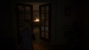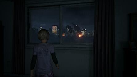 복도로 다시 나가면 Joel의 침실 문이 열려 있고 빛이 쏟아져 나옵니다. 안으로 들어가서 뉴스 보도를 보고 침실 창문 밖에서 폭발을 목격하십시오. 계단을 내려가세요.