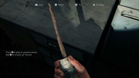 마당에 들어서면 경비원 두 명이 건물 밖으로 걸어 나온다. 당신은 각각 하나를 취할 것이므로 오른쪽에있는 깡패에게 가서 접근하기 위해 웅크 리고 유지하십시오. 은신 처치를 한 다음 그들이 왔던 건물로 돌아가십시오. 여기에 두 명의 악당이 더 있으며 R1과 함께 듣기 모드를 사용하여 정확한 위치를 찾아낼 수 있습니다. 가장 가까운 사람을 은밀히 죽이고 진행에 필요한 창고 열쇠 를 얻기 위해 시체를 약탈하십시오.