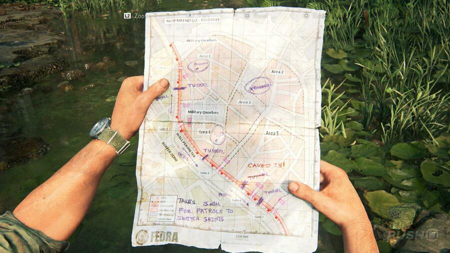이 시점에서 터치패드를 눌러 배낭을 열 수 있어야 합니다. 이미 몇 개의 인공물 을 수집하고 있음을 알 수 있습니다. 첫 번째는 Boston QZ 지도 입니다.
