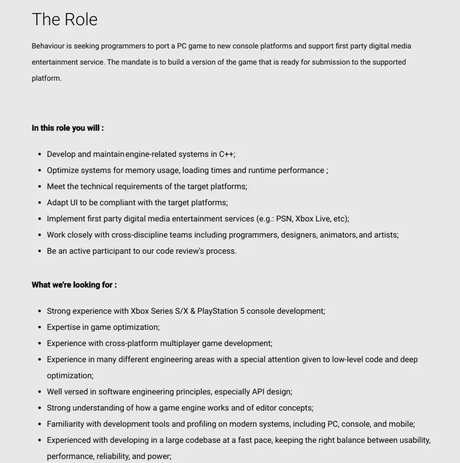 애플리케이션은 “Behaviour는 PC 게임을 새로운 콘솔 플랫폼으로 이식하고 자사 디지털 미디어 엔터테인먼트 서비스를 지원할 프로그래머를 찾고 있습니다. 임무는 지원되는 플랫폼에 제출할 준비가 된 게임 버전을 구축하는 것입니다.”