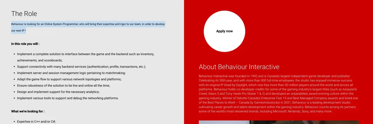 Very Ali Gaming 이 입수한 보고서에 따르면 개발자인 Behavior Interactive는 완전히 새로운 프랜차이즈 작업을 시작했습니다. 회사 웹사이트의 구인 목록 중 하나는 몬트리올에 있는 본사 의 콘솔 시스템 프로그래머 위치입니다.