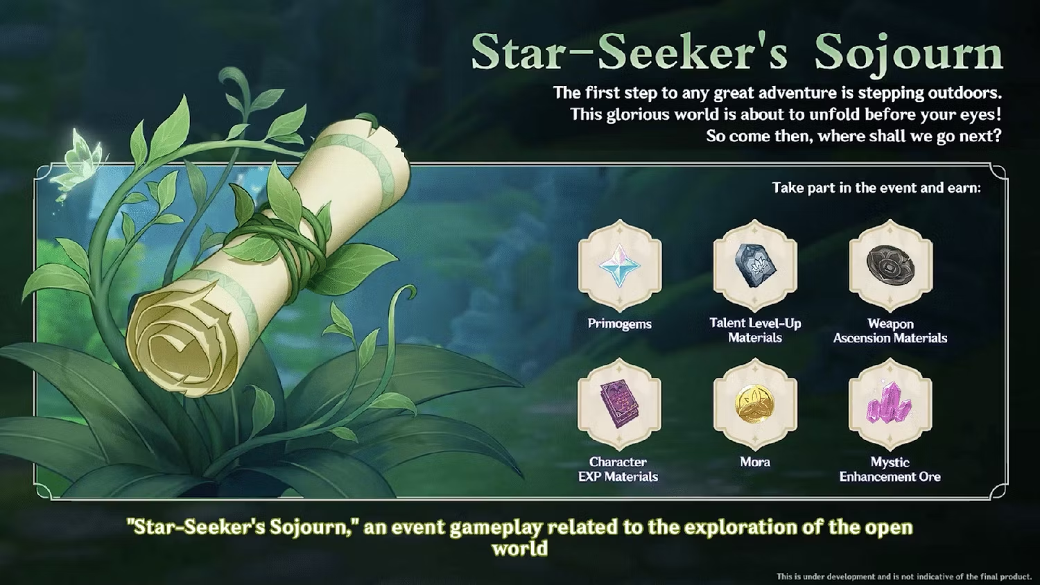 다음 이벤트인 "Star-Seeker's Sojourn"에서는 여행자가 다시 한 번 보물을 찾아 헤매게 됩니다. 이것은 Genshin Impact 의 새로운 활동은 아니지만 이 이벤트는 오픈 월드에 대한 탐험을 주로 다룰 것임을 암시합니다. 즉, "Wind Chaser" 이벤트와 달리 "Star-Seeker's Sojourn"은 여행자를 Teyvat의 새롭고 흥미로운 부분으로 안내할 수 있습니다. 특별한 도구를 장착하여 플레이어는 미래의 별을 검색하고 바누라는 이름의 아이를 도우면서 그들의 미스터리를 풀 수 있기를 바랍니다.