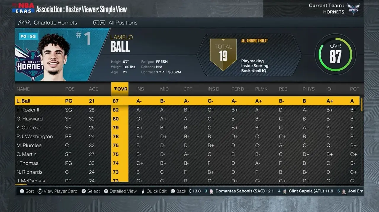 - Charlotte Hornets의 각 선수는 팀의 전체 성과를 이해하는 데 도움이 되는 특정 등급을 가지고 있습니다.