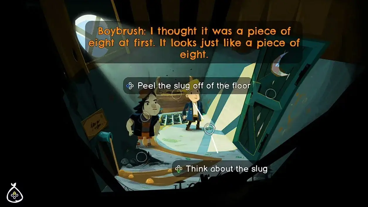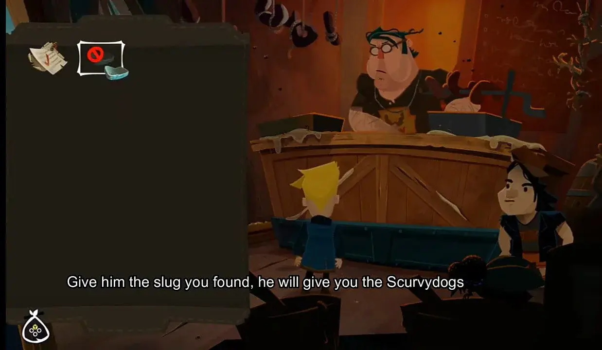 상점으로 돌아가서 슬러그를 Scurvydogs와 교환하십시오. 의자에 앉은 남자에게 가서 괴혈병 개를 데려가십시오. 플레이어가 아이템을 조사하면 새로운 슬러그가 드러납니다. 위조 동전은 크기가 8개 조각입니다.