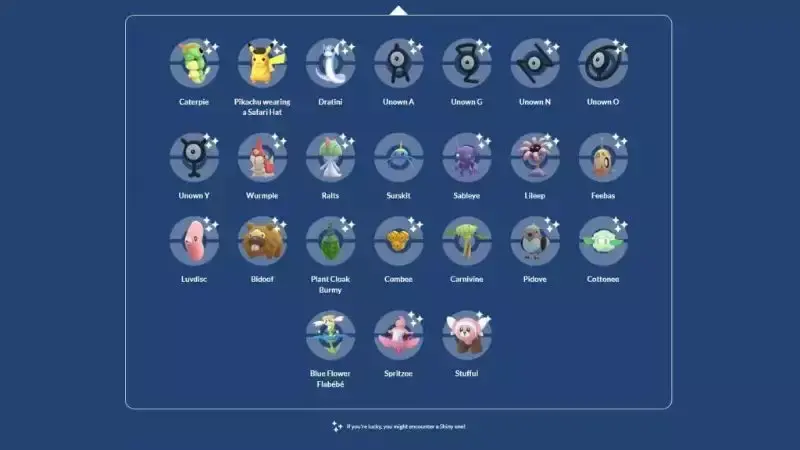 사파리 모자를 쓴 캐터피 피카츄 Dratini Unown A Unown G Unown N Unown O Unown Y Wurmple Ralts Surskit Sableye Lileep Feebas Luvdisc Bidoof Plant Cloak Burmy Combee Carnivine Pidove Cottonee Blue Flower Flabébé Spritzee Stufful