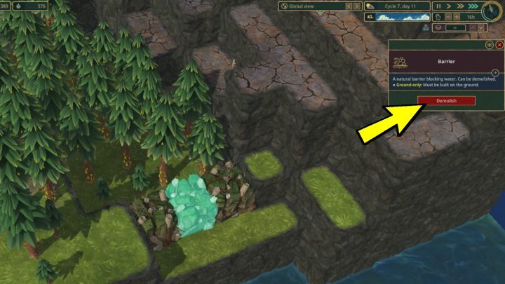 지도에서 일꾼 중 한 명이 제거할 수 있는 자연 댐을 찾을 수 있습니다. 장벽을 선택하고 파괴를 클릭하십시오 . 작업자가 해당 장벽에 도달할 수 있는 경우(즉, 근처에 도로가 있거나 장벽이 다른 섬에 있는 경우 다리가 있는 경우) 잠시 후 이를 제거하고 그 뒤에 있는 지역이 물에 잠길 것입니다. 해당 지역이 흐르는 강과 같거나 낮은 수위일 경우 범람할 수 있음을 기억하십시오.