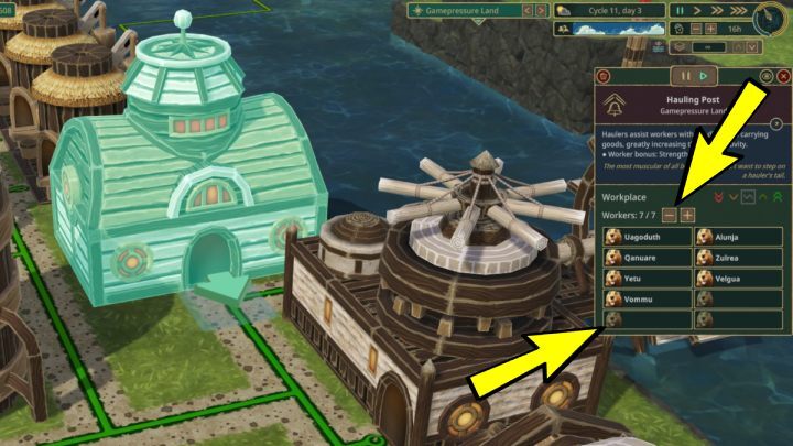 비버의 기본 노동시간은 16시간이다. 화면 오른쪽 상단 모서리에 있는 더하기 및 빼기 아이콘을 사용하여 필요에 따라 이 시간을 수정할 수 있습니다. 가뭄이 다가오고 있고 식민지가 아직 충분한 자원을 준비하지 못한 상황에 처했다면 더 열심히 일하도록 강요하십시오. 이렇게 하면 작업장에서 더 많은 물과 음식을 수집하고 자원을 생산할 수 있습니다.