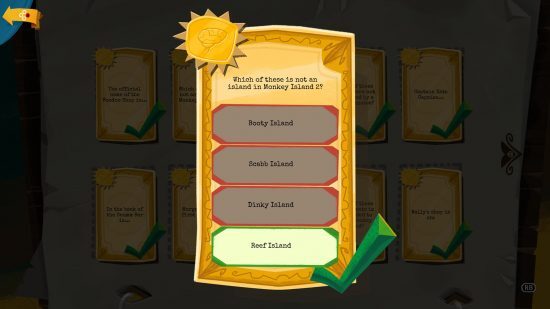 뽑을 때 받는 질문은 무작위이며 책에서 카드의 위치는 객관식 질문에 올바르게 답한 경우에만 영구적이 됩니다. 실패하면 카드를 잃게 되지만 두려워하지 마십시오. 다시 나타날 것이므로 계속해서 책을 채울 카드를 더 찾기만 하면 됩니다. 그러면 결국 다시 시도할 수 있습니다. 다음은 Return to Monkey Island의 모든 퀴즈 질문에 대한 답변입니다. 따라서 퀴즈 책을 작성하고 맛있는 업적을 얻을 수 있습니다.