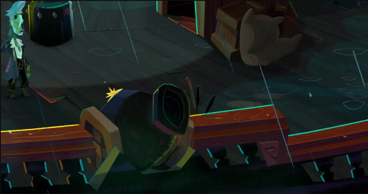 모든 선원의 우려를 해소하고 Guybrush 계획에 투표하도록 설득했다고 가정하면 이제 Flattened 해골을 다른 배로 가져오기만 하면 됩니다. 이렇게 하려면 앞서 발견한 해골을 대포에 장전하고 불을 붙이고 다른 함선으로 보내면 됩니다.